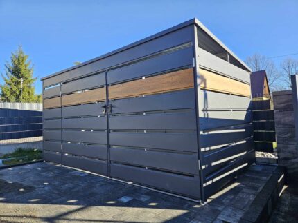 👉szerokość 4m👉długość 2m👉pokryta blacha panelowa w kolorze grafit i multigros👉konstrukcja wykonana z profilu zamkniętego ocynkowanego 👉spad dachu w tył